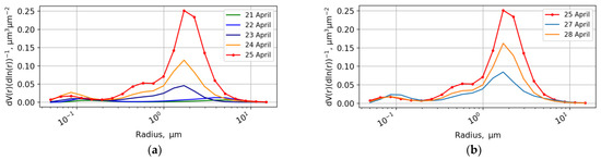 Aerosol volume size distribution on (a) 21–25 April and (b) 25–28 April 2019. Data level 2.0. Data on 26 April are not available.