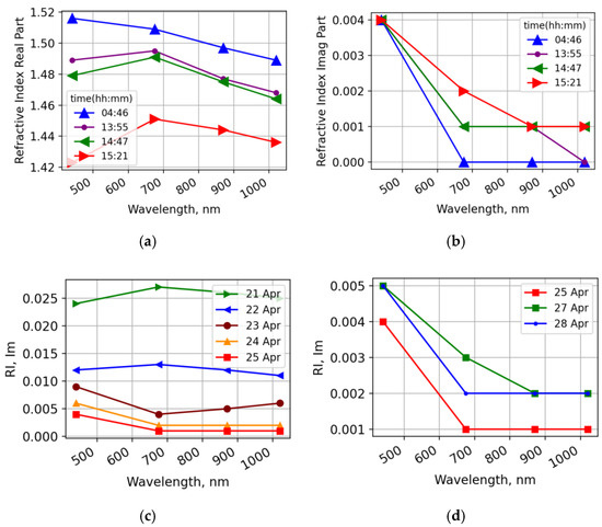 Refractive index: (a) real part, (b) imaginary part on 25 April 2019, data level 2.0; imaginary part (c) 25 April 2019, (d) 25, 27, 28 April 2019, data level 1.5. RI values on 26 April 2019 are not available.