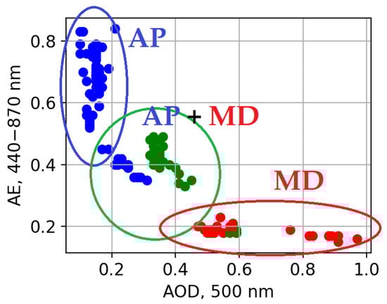 Scatter plot for aerosol optical depth (500 nm) versus Ångström exponent (440–870 nm) dependency during 23–25 April 2019: blue dots—23 April, green—24 April, and red—25 April. AP—anthropogenic aerosol particles; MD—mineral dust. Data level 2.0.