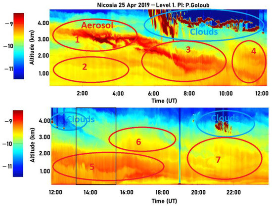 Lidar time series of range-corrected backscatter signal (in arbitrary unit) for Nicosia, Cyprus, 25 April 2019. Blue circles indicate the clouds, and red circles and numbers (1–7) mark the aerosol layers.