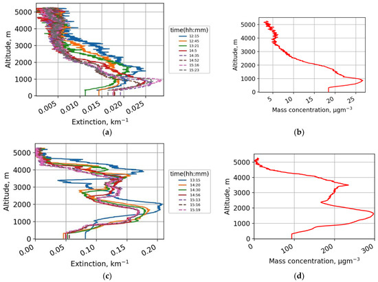 Extinction altitude profiles on (a) 21 April in the period from 12 h 15 m until 15 h 23 m and (c) 25 April in the period from 13 h 15 m until 15 h 19 m; average mass concentration altitude profiles on (b) 21 April and (d) 25 April in the atmosphere over Nicosia.