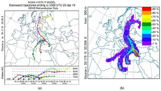 For air mass movement calculation, the HYSPLIT model uses meteorological data files from the Global Data Assimilation System (GDAS), which includes a variety of data from different instruments and sources of data: satellite, ground-based, and aircraft measurements [36]. To study the impact of air mass transport from different regions to Nicosia, the calculations of backward trajectories for different periods and trajectory frequency have been provided. The 6-day backward trajectories are presented in Figure 10a.
