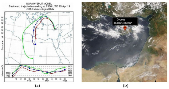(a) Backward trajectory of the air mass movement at 23 UTC: red trajectory corresponds to air mass transport that started at an altitude of 1500 m AGL at 00 h on 23 April and finished at 100 m (AGL) at Nicosia, blue—came from around 2000 m AGL to 500 m AGL and green—from 2500 to 1000 m AGL (map shows the horizontal movement and scale at the bottom the vertical movements of air mass), and (b) Aqua/MODIS image on 25 April 2019 [53], Cyprus, Eastern Mediterranean.