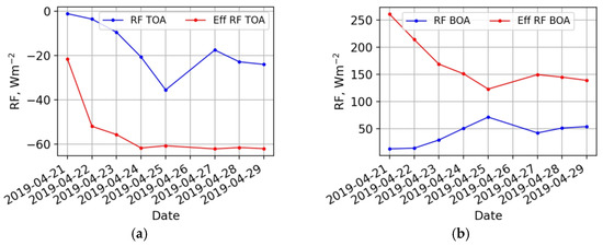 Radiative forcing (RF) and effective radiative forcing (ERF) are the measure of the net change in the Earth system’s energy balance due to changes in different atmospheric constituents. RF is defined as the difference in net downward flux (shortwave + longwave) at the tropopause after obtaining the stratospheric temperatures to radiative equilibrium [1]. That means RF does not include the impact of short-term changes in the atmosphere. The ERF concept allows estimating an influence of rapid changes for all atmospheric variables including aerosols [1]. The RF and ERF daily averaged values were retrieved from the AERONET website for the period 21–29 April when the discussed aerosol outbreak took place [24]. At the top of the atmosphere, RF and ERF changes have similar dynamics: in both cases, after 21 April, they start to decrease (see Figure 12a). RF values changed from ~0 Wm−2 on 21 April to −38 Wm−2 on 25 April, and then slightly increased.