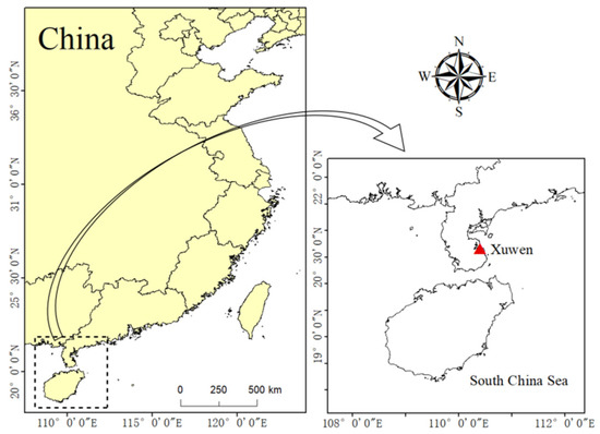 The data in this paper came from Xuwen (Figure 1), which located in South China Sea. The tide was observed by the pressure type tide gauge named KELLER (Figure 2), a self-contained tide level instrument of DCX-22 made in Switzerland, with a measuring range of 0–20 m and a measuring accuracy of +0.05%FS (Full Scale). KELLER collected data with the interval of 10 min and each observation was a 1-min average with the accuracy of 0.01 m. KELLER is installed by “insertion rod method” (as shown in Figure 2). During the installation, the PVC pipe with a diameter of 8 cm and 6mm thickness of the pipe wall is selected, and water penetration holes are made on the pipe wall. The wooden pole of more than 5 m is inserted into the measuring position, the mud entry depth is approximately 2 m, to ensure the stability of the wooden pole, the PVC pipe was fixed at the bottom of the wooden pole, and finally the tide instrument was fixed in the PVC pipe. The depth of observation point is approximately 5 m.