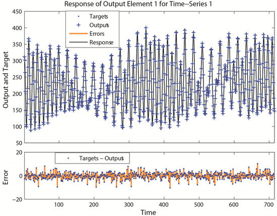 Figure 3 shows the response of output element for data series; we can see that the predicted values are in good agreement with the actual observations. The error values are mostly in the range of −5 to 5 cm, with some points exceeding ±10 cm. Relative to the observed data, the error is roughly within 5%.