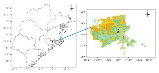 Distribution of meteorological station and environmental monitoring station in Putian (1. Meteorological Station; 2. Canghou Road; 3. Environmental monitoring station of Putian; 4. Hanjiang No. 6 middle school; 5. Xiuyu district government).