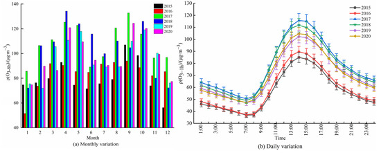 Figure 2 shows the monthly and hourly concentrations of surface O3 in PT from 2015 to 2020. There were two peaks of O3 concentrations that occurred in April to May (spring) and September to October (autumn), respectively (Figure 2a). O3 concentrations tended to be relatively low from November to February and June to August. As shown in Figure 2b, O3 values were higher at noon and lower at night. During the six years, O3 hourly concentrations peaked at 14:00 and then dropped to the lowest at 7:00. The hourly O3 concentrations from 2015 to 2016 were significantly lower than in 2017 to 2020, indicating the increasing trend of surface O3 levels in recent years.