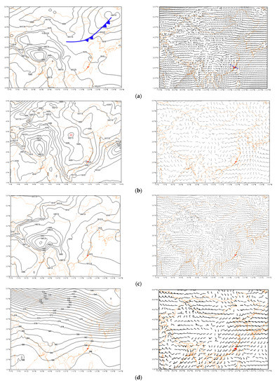 The mean sea-level pressure field and wind field at 925 hPa for each SWP during the polluted days from 2015 to 2020. Sea-level pressure ((a–c) left); 925 hPa wind ((a–c) right) 500 hPa geopotential height ((d) left); 925 hPa wind ((d) right); the star represents the study area. (a) Warm sector ahead of front—Type FS; (b) cold high-pressure ridge—Type GN; (c) transformed surface cold high—Type GS; (d) edge of subtropical high pressure—Type BB.