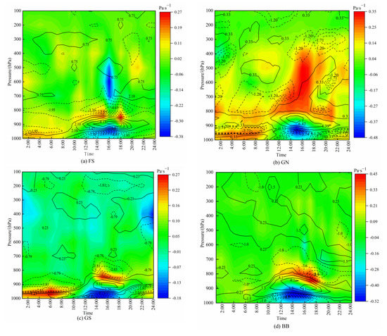 Vertical velocity (the shaded, unit: Pa s−1) and divergence (black line, the dotted lines mean convergence and solid lines mean divergence, unit: 10 s−5) at different pressure levels for each SWP. (a) Warm sector ahead of front—Type FS; (b) cold high-pressure ridge—Type GN; (c) transformed surface cold high—Type GS; (d) edge of subtropical high pressure—Type BB.