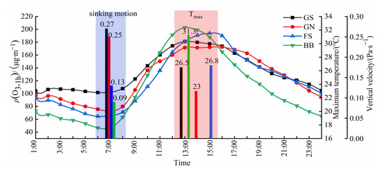 Figure 5 shows the diurnal variation of the O3 concentration for four SWPs. It was found that from 12:00 to 16:00 when the photochemical reaction is strong, the peak O3 concentration was the highest under the SWP with the highest Tmax. In addition, the valley value of the O3 concentration at night was related to the vertical velocity. Without any sinking motion during this period, the O3 concentration was lowest under Type BB (46.8 μg m−3 at 7:00). Due to the deep sinking motion under Type GN (0.25 Pa s−1) and Type GS (0.27 Pa s−1), the pollutants tended to accumulate near the surface and resulted in the higher valley value of O3 (72.6 μg m−3 and 101.0 μg m−3, respectively).