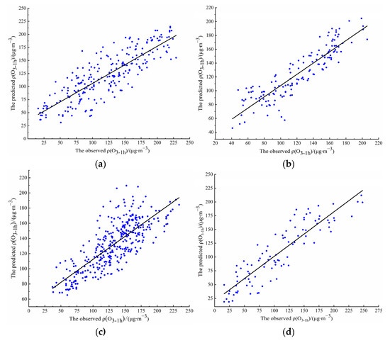 Scatterplots of predicted versus observed O3 concentrations for the four SWPs. (a) Type FS; (b) Type GN; (c) Type GS (d); Type BB.