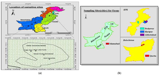 Sampling of ozone was conducted at Hattar Industrial Estate, Haripur, KPK, Pakistan. Sampling was done at indoors industrial units, and outdoors of industries. Hattar is situated in District Khyber Pakhtunkhwa at 33°51′71″ N and 72°51′8″ E. It covers a total area of 4.30 km2 and has many heavy electrical, leather, and cement factories, iron and steel mills, food processing facilities, chemical plants, pharmaceutical firms, butter, fat, and vegetable oil manufacturing industries, etc. as described in Figure 1 [28]. For control sampling of ozone, triplicate readings from 10 sampling points (50 km away from the industries, less polluted area of Sultan Pur) were measured with help of a portable SKY 2000-WH-Ozone meter. For indoor sampling, 288 samples were obtained from units of food processing facilities, such as batter preparation, mixing, baking, cooling, cutting, deposition, and distribution: gate 1, gate 2, and gate 3. From these 8 different units of the food industry, 24 samples were taken per day (24/day) × 12 months = total 288 samples. Average values were used to plot a graph. A similar sampling pattern was followed for the steel and oil industries. The total number of samples obtained from these industries was 864/12 months. For control samples, 20 samples were taken per day from 10 different units of the food industry (20 samples/day) × 12 months = total 240 samples. Average values were used to plot graphs.