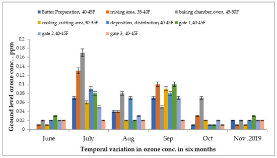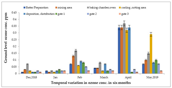 To determine the concentrations of ground-level ozone level were monitored in several units of the food industry from December 2018 to May 2019, as presented in Figure 3, by taking 24 samples from each chamber area, including batter preparation, mixing, cutting, cooling, and baking. Approximately 288 samples were obtained on average over six months. In the oven area, the highest concentration was detected at 0.37 ppm, followed by the baking chamber at 0.36 ppm in the month of March 2019. Meanwhile, the lowest reading was detected at 0.002 ppm in the batter preparation area in the month of December 2018. The temperature of each site was different due to various processes, resulting in changes in ozone concentrations. The outdoor concentration was reduced at gate 3, at approximately 0.03 ppm, which was at least 30 km away from the indoor areas.