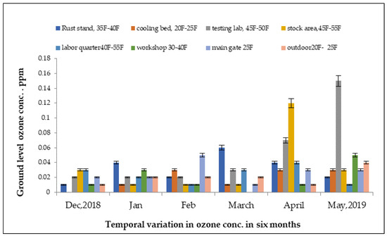 The ground-level ozone concentrations in understudy steel mill of Hattar Industrial Estate, from December 2018 to May 2019, are shown in Figure 5. The highest concentration was recorded at 0.15 ppm in an indoor environment, while the lowest concentration of ozone was recorded at 0.01 ppm in the loading area. The surface-level ozone concentration was highest in the month of May and lowest in the month of December in units of the steel mill. The high concentration was due to the increase in temperature in the month of May.