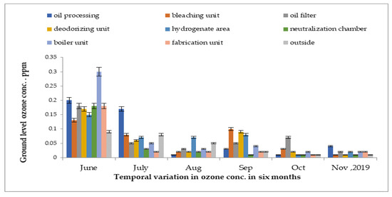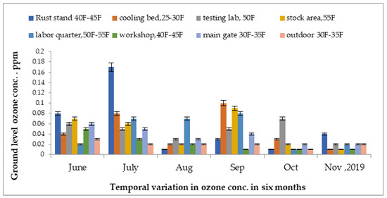 Concentrations of ground-level ozone in the steel industry measured from June 2019 to November 2019 are presented in Figure 6. In the rust stand area, the highest reading was detected at 0.17 ppm in the month of July 2019 while lowest reading was detected at 0.001 ppm in the stock unit in the month of November 2019.