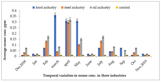The ground-level ozone concentrations of three industries are represented in Figure 9. The highest concentration was recorded at 0.37 ppm in the indoor environment of the food industry, whereas the lowest concentration of ozone was recorded at 0.001 ppm in the cooling area of the steel industry in the month of December. The ground-level ozone concentrations were highest in the month of March and lowest in the month of September in units of the steel mill in the year 2019. The high concentrations were due to the increase in temperature in the months of March, May, and June, as compared to the control site.