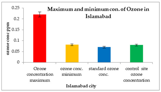 The concentrations of ozone in Islamabad, Haripur, and Abbottabad were greater than those at the control site (Sultanpur Havelian). High ground-level ozone concentrations in these study areas may be due to dense traffic, population, and the use of other chemical products.