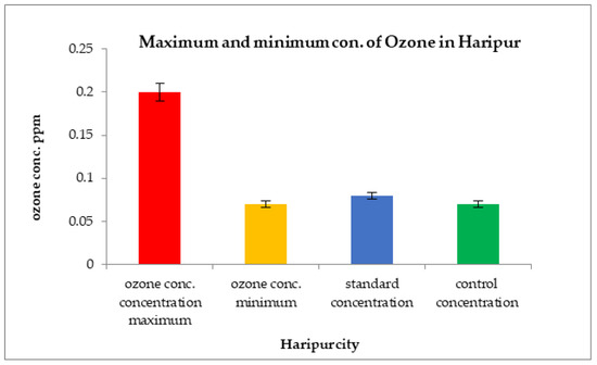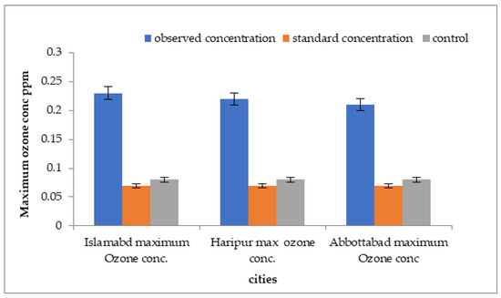 Comparisons of over than standard values of ozone concentration with standard values for three cities are shown in Figure 13. The highest outdoor ground-level ozone concentration, at 0.23 ppm, was detected in Islamabad. The minimum ground-level ozone concentration was observed in Abbottabad.