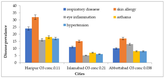 Disease prevalence associated with ozone exposure in 3 megacities of Pakistan.