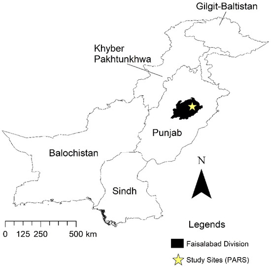 This study was conducted during the winter of each year from 2018–2021 at the Post Graduate Agriculture Research Station (PARS), the University of Agriculture Faisalabad (UAF), Pakistan. The area is located around latitude 31°25′ N, longitude 73°09′ E, and at an altitude 184.4 m above sea level in a semiarid subtropical climate with a mean annual rainfall of 350 mm. The location of the study area is shown in Figure 1.