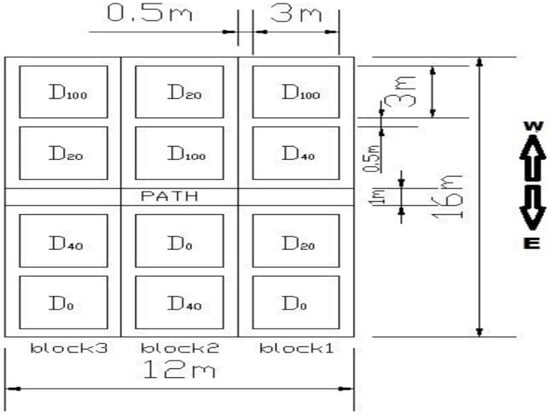 The soil conditions of experimental area are medium to coarse. Generally, soils are naturally low in organic matter content [34,35,36]. The major crops of this region are wheat (rabi), rice, and cotton (kharif). The wheat variety Galaxy 2013’s seeds were sown by using seed drill. The total experimental area of 192 m2 was divided into three blocks, and each block was further sub-divided into four plots of 3 × 3 m (9 m2) in a randomized, complete block design with four treatments and three replications (Figure 2).