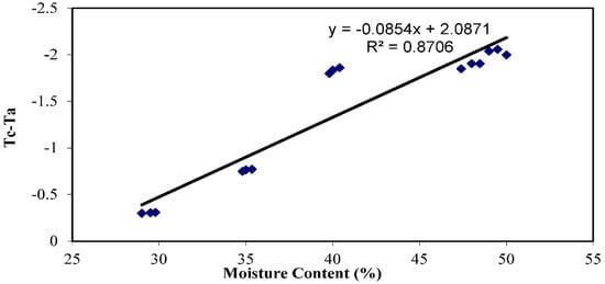 The relationship developed between the soil moisture content and the canopy–air temperature difference showed that with the decrease in the soil moisture content, the canopy–air temperature difference increases (Figure 3). The coefficient of determination (R2) was determined as 0.87 for this relationship.