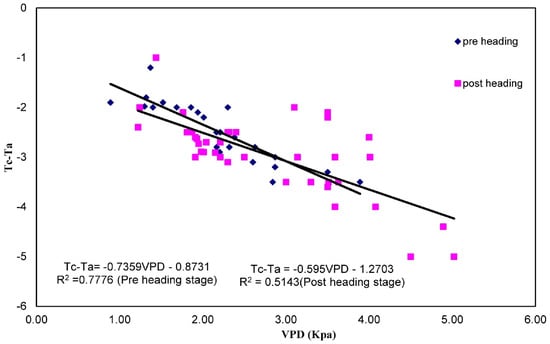 The R2 values were 0.51 and 0.78 for the post-heading and pre-heading stages, respectively, during the 2018–2021 wheat-cropping period. The lower baseline (ll) equations developed for the pre-heading and post-heading stages were (Tc−Ta) ll = −0.735 (VPD) − 0.8731 and (Tc–Ta) ll = −0.5143 (VPD) − 1.2703, respectively.