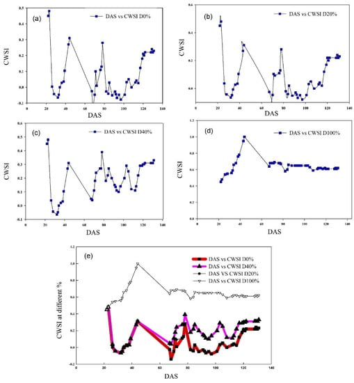 Relationship between DAS and CWSI for different irrigation deficit treatments (a) at D0%, (b) at D20%, (c) at D40%, and (d) at D100%; (e) combined trend of all deficit levels.