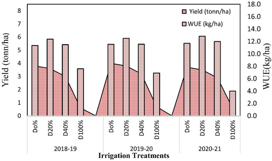 An analysis comparing the crop yield and irrigation management is important for the efficient use of local resources [43]. Many researchers have pointed out the enlightening association between the grain yield and the depth of irrigation in response to various irrigation regimes [44]. D0% was the best treatment for yield production, with an estimated yield of 3.8 ton/ha (Table 5, Figure 6).