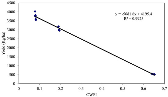 The relationship between yield (kg ha−1) and the seasonal mean CWSI values was linear (Figure 7). This relationship indicated that the CWSI and yield of wheat crops are inversely proportional to each other, meaning that the yield of wheat will decrease with an increase in the CWSI. The wheat crop yield was at its maximum level when the CWSI was at its minimum level. This relationship can be used to predict the yield potential of wheat. Generally, drought stress increases the CWSI. Values of the CWSI from 0 to 0.3 mean that the crops have enough water, while values in the range of 0.3 to 0.6 mean the crops are under stress [46]. Full irrigation is difficult due to water shortages; therefore, deficit irrigation can be employed as an option to save water and achieve high grain yields [47].
