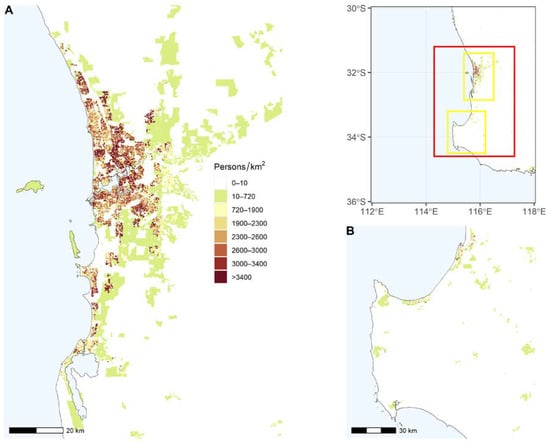 Study area and population. Map on top right shows the study region within the red rectangle and two sub-regions enclosed within yellow rectangles. Map on left shows population density for the city of Perth region (panel (A)) and map on lower right shows the population density for the southwest of the study area (B).