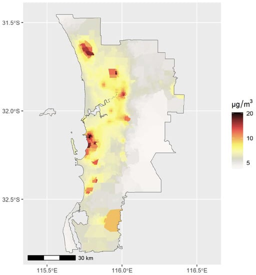 Annual average PM2.5 (ug/m3) were modelled using CCAM-CTM and results from the two inner domains were used to derive exposure for the study population. That is, data from the 1 km domain (for GMR Perth) and the 3 km domain for areas to the south. Gridded annual average PM2.5 concentrations were first extracted to census mesh blocks, which are the smallest geographic areas defined by the Australian Bureau of Statistics (ABS) [39]. Figure 3 presents baseline annual mean PM2.5 concentrations () for GMR Perth simulated by the CCAM-CTM from the baseline emissions inventory.