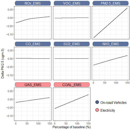 Estimates of the incremental change in annual average PM2.5 concentration (ΔPM2.5) were produced by subtracting from any subsequent CTM simulation based on perturbations to emissions from the two sectors of interest. Thus, ΔPM2.5 can be interpreted as the change in PM2.5 expected for a given change in on-road vehicle emissions and/or change in emissions produced by electricity generation.