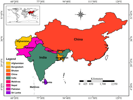 This study takes the OBOR South Asian countries and China as the study area (Figure 1). South Asia includes Afghanistan, India, Pakistan, Bangladesh, Sri Lanka, Nepal, Bhutan, and the Maldives: total population density 362.3/km2 (938/sq mi), with an area of 5,134,641 km2 (1,982,496 sq mi) and a population of 1.94 billion (2020). However, some would place Afghanistan more firmly in either Western or Central Asia or even in the Middle East. The region became a British protectorate after the Second Anglo–Afghan War and remained so until 1919. Although Myanmar (formerly Burma) was part of the British Raj from 1886 to 1937, it is now generally considered a part of Southeast Asia due to its membership in the Association of Southeast Asian Nations (ASEAN). Despite having been ruled by the British Raj at different points in history, neither the Aden Colony nor British Somaliland, nor Singapore has ever been considered to be a part of South Asia. Aksai Chin, formerly a part of the British Indian princely state of Jammu and Kashmir, is now a part of the Chinese autonomous region of Xinjiang and was claimed by India and may also be included in this area.