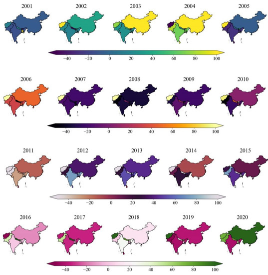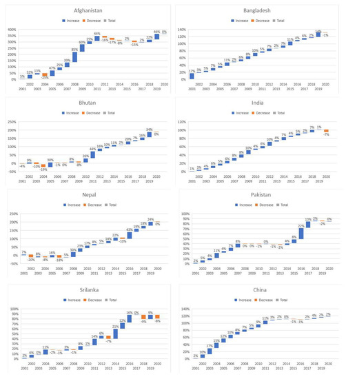 Figure 4 shows the significant increases in carbon emissions from 2001–2020. Afghanistan recorded a greater change in 2008 with an increase of 85% in carbon emissions, while in the last 20 years, the lowest decrease in carbon emissions occurred in 2004 at −25%. Similarly, a gradual increase in carbon emissions in Bangladesh and India was observed because of the yearly increase in GDP and industrialization, but that increase in emissions was steady and not too high. Before the Chinese program of the China-Pakistan Economic Corridor (CPEC), the emissions of carbon were lower in Pakistan because of the low increase in GDP, but as soon as the OBOR initiative emerged in 2013, the highest carbon emissions were observed in 2016 with a 22% rise with respect to last year. In the last few years, Srilanka has had many economic crises, with an observed decrease in carbon emissions, but after OBOR, it also has a similar pattern to Pakistan, with higher growth in 2014 at 21% due to the rise in GDP. Nepal’s economic development is increasing with respect to time, and this is causing an increase in carbon emissions; during the last five years, it has increased by 20% almost every year.