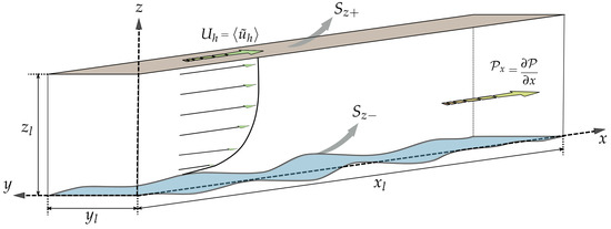 A volume domain is defined in the air (specific mass ) with sizes , bounded below at by the air–water free surface, and above at by the freestream, as exemplified in Figure 1. Wind and waves are aligned and propagate in the longitudinal direction (x axis). The free surface dynamics may be imposed by any single-valued function .