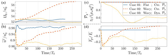 Time histories are shown in Figure 3, by employing sliding-time statistics with long average periods . The normalized mean wind velocity in the last cell layer (, with ) is shown in Figure 3a. In the flat-bottom case (Case 01), the freestream velocity deviates % from its initial value. The wave acts as an additional driving force dragging the wind above. Therefore, without a diminishing balancing the additional momentum transferred to the wind, the freestream velocity is greatly augmented by the introduction of the wave in Case 02, reaching values ∼14% higher than . In Case 03, the dynamic algorithm is activated, and the target velocity is shown as the horizontal line in the figure. With this approach, the freestream velocity deviates only ∼1% from the target, when in Case 03.