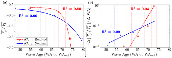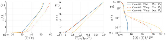 Inferred from the velocity time histories in Figure 3a,b, the different wave ages between Cases 02 and 03 qualitatively justify the differences in the turbulent profiles of Figure 4b,c, where they are normalized by the resolved friction velocity . In the turbulent profiles, the disturbances previously reported in [52], for the TKE and the total shear stresses, are again observed in Figure 4, and increased in Case 03, where the WA is higher. A systematic WA comparison is presented in Section 5.