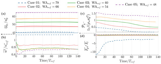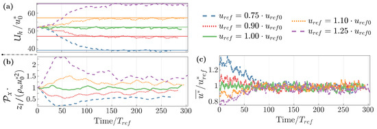 Time histories are shown in Figure 5, by employing sliding-time statistics with short average periods , in order to assess the different turbulence levels and periods that characterize the evolution of different quantities. The mean wind velocity in the last cell layer () is shown in Figure 5a, showing that it tends to the specified values () depicted by the horizontal lines in the figure. The low level of fluctuations revealed for is consistent with the low turbulence level imposed by the upper BC.
