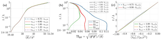 The vertical wind and turbulent profiles are shown in Figure 6. They provide further evidence that self-similarity is preserved since the cases almost perfectly collapse in the non-dimensional, mean longitudinal velocity , turbulence intensity (TI) TI, and total shear stresses , shown respectively in Figure 6a–c.