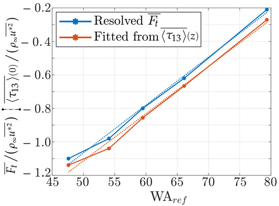 The wavy bottom surface invariably requires the problem to be formulated in surface-following coordinates, which leads to the pressure acting as a momentum flux mechanism in the Navier–Stokes equations [14]. Therefore, the total flux (stress) becomes a combination between pressure and friction (resolved and SGS) terms, written as . The pressure term is , and equals the pressure drag () at , where . The resolved friction term is , and the SGS term is .