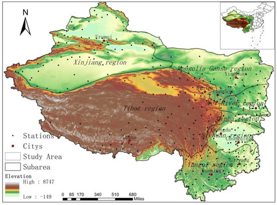 The research scope of this study is the western region of China, including the southwest and northwest. In the north, west, and south of the study area, the national boundary or demarcation mountains are taken as the boundary, while in the east, the eastern boundaries of Yunnan, Guizhou, Chongqing, Shaanxi, and other provincial administrative regions, represent the study area. Inner Mongolia includes Alxa League, Wuhai City, Bayannur City, and Ordos City, which are mainly concentrated in continental temperate desert climate areas in western Inner Mongolia. Based on the climatic zoning map of China compiled by the China National Meteorological Administration in 1978 and the precipitation distribution data in western China, the study regions were divided into seven regions: the Xinjiang region, the Qinghai–Tibet region, the Menggan region, the Weihe region, the Qinba region, the Sichuan region, and the Yunnan–Guizhou region through consolidation and statistics [23,24]. The division is shown in Figure 1.