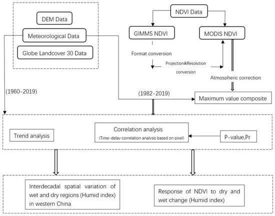 Based on the MODIS NDVI data, this paper converts the spatial resolution and projection of the GIMMS NDVI dataset, resampling the spatial resolution to 250 m to make it consistent with the MODIS NDVI. At the same time, the scope of the two datasets was trimmed based on vector data to reflect the research range of the study (the western region). After the two kinds of NDVI data underwent the pre-processing process of resampling, data clipping, projection conversion, etc., GIMMS NDVI data and MODIS NDVI data of monthly scale were obtained by the maximum value synthesis method to further eliminate the difference between the two datasets, to extend the NDVI data and use it for follow-up continuity research [25]. The vegetation growth season was determined to be from May to September in western China, and the time lag effect between vegetation growth season and the humidity index was analyzed.