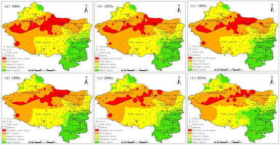- Qinghai–Tibet Region. As shown in Figure 3, the extent of extremely arid and arid regions in the Qinghai–Tibet Plateau has decreased from 4.54% in the 1960s to 1.87% in the 2010s, mainly in the northern part of Qaidam District and the western part of the Qilian–Qinghai Lake region. The extent of arid areas decreased from 42.82% to 17.56%, mainly in western Shigatse and Ngari. The extent of subhumid and humid areas increased significantly, from 5.94% in the 1960s to 25.77% in the 2010s for subhumid areas, and from 2.15% to 11.23% for humid areas, mainly in the Bomi–West Sichuan area.