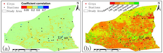 Spatial distribution of maximum cross-correlation (a) between NDVI and humidity index and time-lag response (b) in the Weihe region.