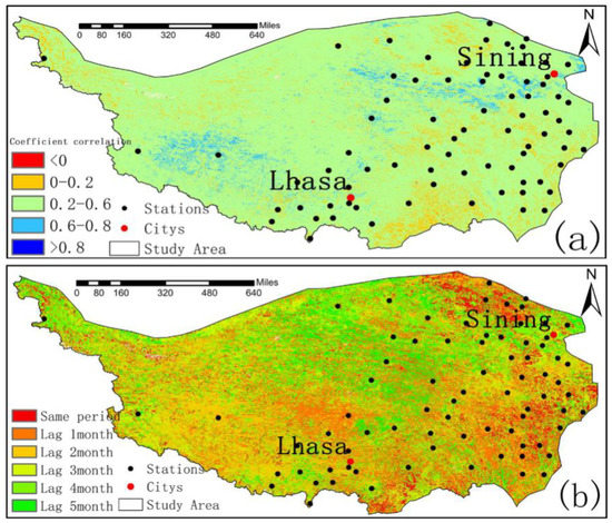 Spatial distribution of maximum cross-correlation (a) between NDVI and humidity index and time-lag response (b) in the Qinghai-Tibet region.