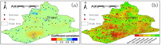 Spatial distribution of maximum cross-correlation (a) between NDVI and humidity index and time-lag response (b) in the Xinjiang region.