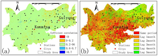 Spatial distribution of maximum cross-correlation (a) between NDVI and humidity index and time-lag response (b) in the Yunnan-Guizhou region.