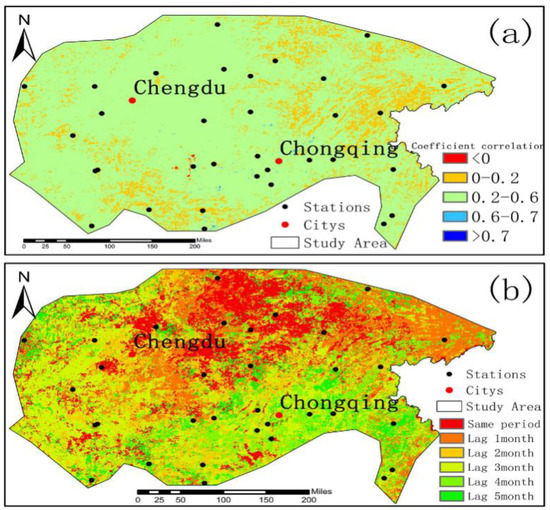 Spatial distribution of maximum cross-correlation (a) between NDVI and humidity index and time-lag response (b) in the Sichuan region.